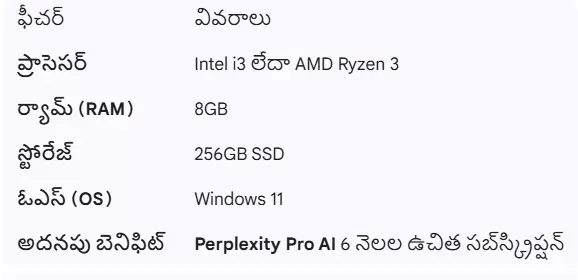 ప్రభుత్వం నాణ్యమైన బ్రాండెడ్ ల్యాప్టాప్లను (Dell, Acer, HP) అందిస్తోంది. వీటిలో ఉండే ఫీచర్లు ఇవే: