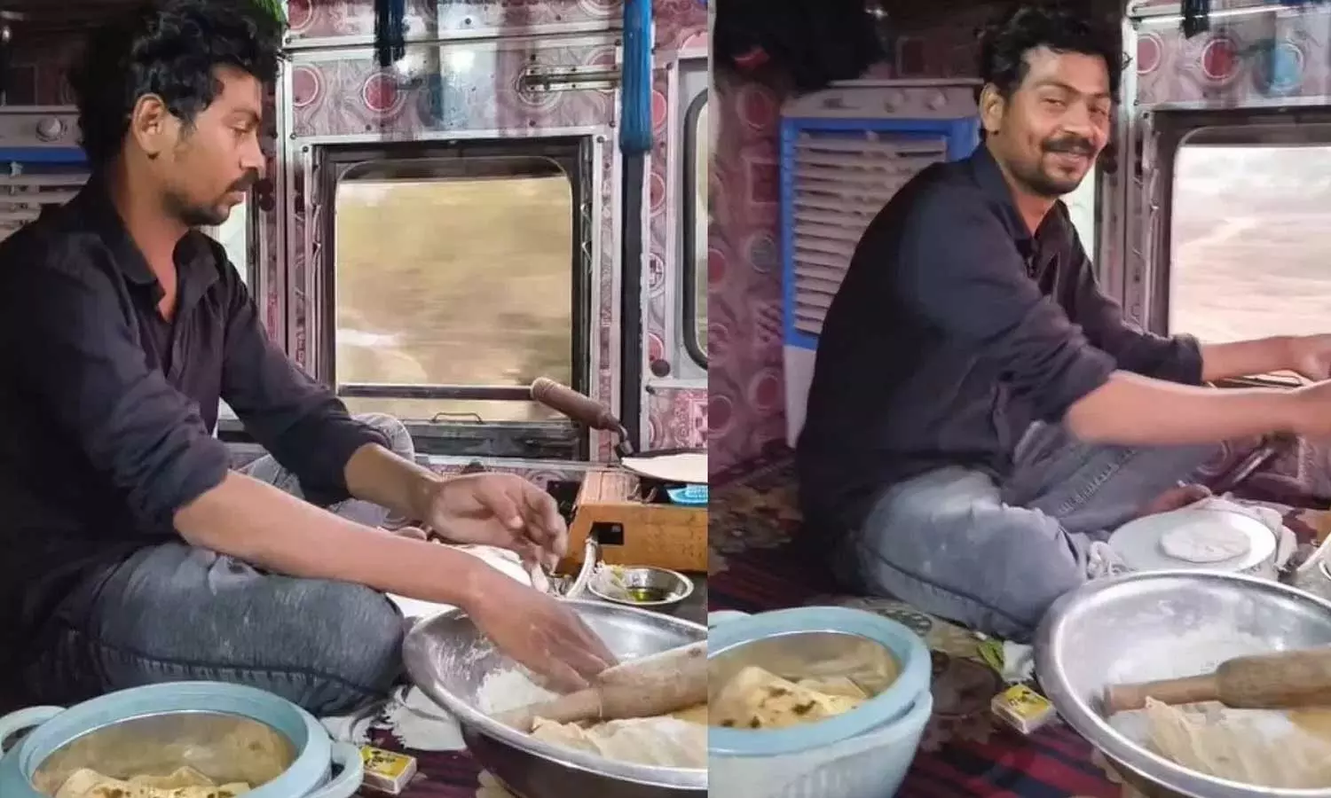 సాధారణంగా ట్రక్ డ్రైవర్లు ఎక్కడో ఒక చోట బండి ఆపి, కింద పొయ్యి వెలిగించుకుని వంట చేసుకోవడం మనం చూస్తూనే ఉంటాం. కానీ ఈ వీడియోలో సీన్ మొత్తం రివర్స్. రోడ్డు ఖాళీగా ఉంది, లారీ ఫుల్ స్పీడుతో వెళ్తోంది. కానీ కేబిన్ లోపల మాత్రం డ్రైవర్ సీటు పక్కనే ఒక వ్యక్తి హాయిగా కూర్చుని గ్యాస్ స్టవ్ మీద రొట్టెలు కాలుస్తున్నాడు. లారీ కుదుపులకు లోనవుతున్నా సరే, అతను మాత్రం ఎంతో ఏకాగ్రతతో తన పనిలో నిమగ్నమైపోయాడు. హోటళ్లు లేదా ధాబాల దగ్గర ఆగి సమయం వృధా చేసుకోవడం ఇష్టం లేకే ఇలా నడుస్తున్న బండిలోనే వంట చేస్తున్నట్లు కనిపిస్తోంది.