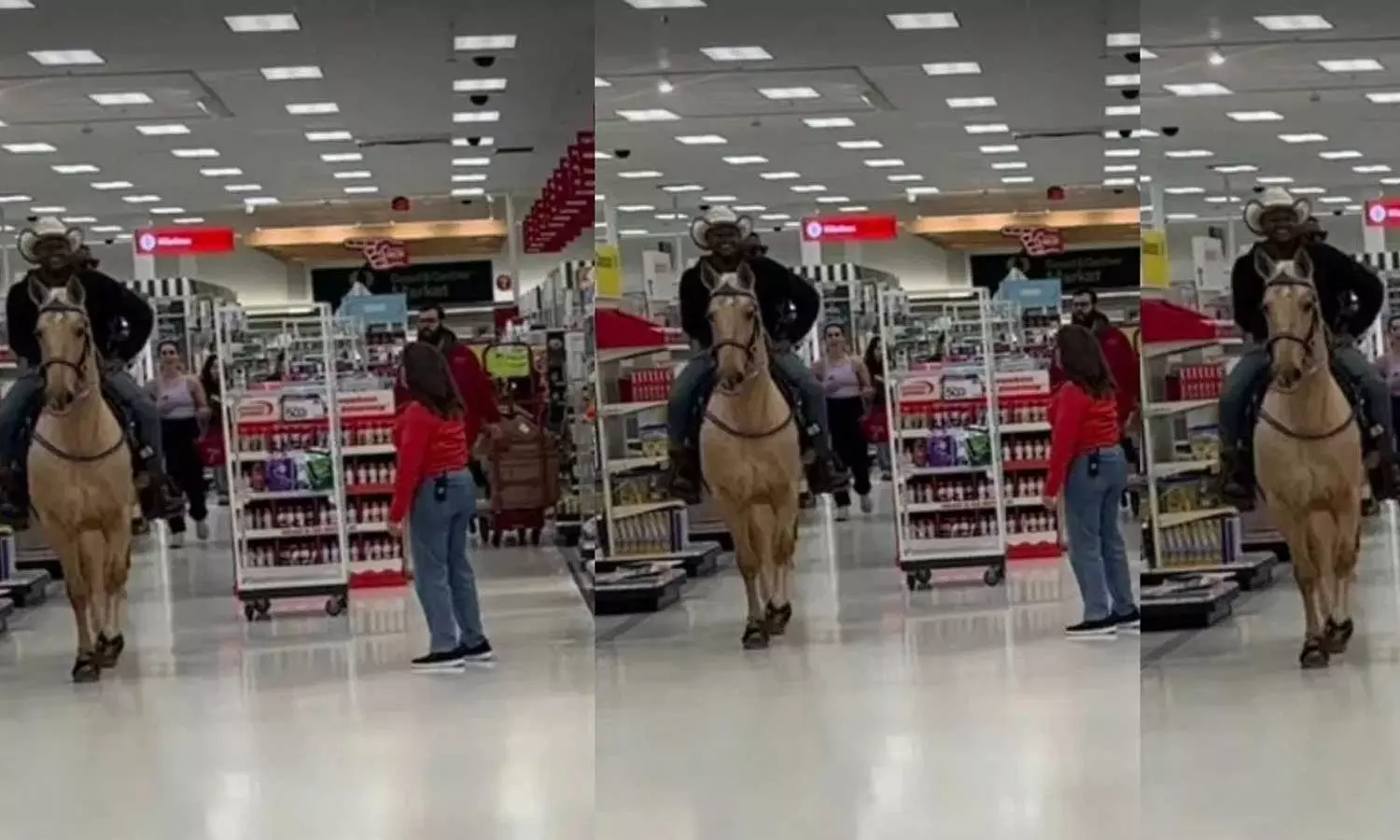 Viral Video: షాపింగ్ మాల్స్కు వెళ్లినప్పుడు రకరకాల వింత మనుషులు కనిపిస్తుంటారు. కానీ అమెరికాలోని టెక్సాస్ రాష్ట్రంలో ఉన్న ఒక టార్గెట్ స్టోర్లోకి వెళ్లిన కస్టమర్లకు మాత్రం ఊహించని షాక్ తగిలింది. ఒక వ్యక్తి ఏకంగా గుర్రం ఎక్కి షాపింగ్ మాల్లోకి ఎంట్రీ ఇచ్చాడు. గుర్రాన్ని చూసి జనం భయంతో పరుగులు తీస్తుంటే, ఆ గుర్రం చేసిన పనికి స్టోర్ సిబ్బందికి పిచ్చెక్కిపోయింది. ప్రస్తుతం దీనికి సంబంధించిన వీడియో సోషల్ మీడియాలో విపరీతంగా వైరల్ అవుతోంది.